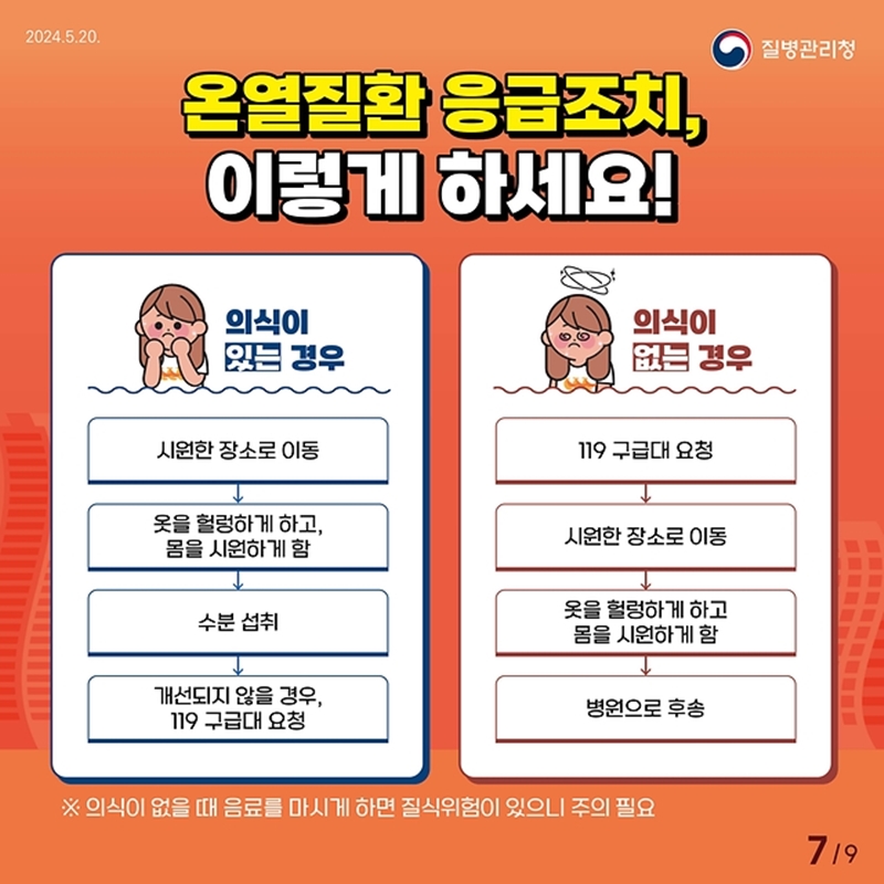 온열질환 예방을 위해 항상 물을 자주 마시고, 시원한 환경을 유지하며, 무리한 야외활동을 피하는 것이 중요합니다. 이 정보를 주변 사람들과 공유하여 모두가 건강한 여름을 보낼 수 있도록 도와주세요.
