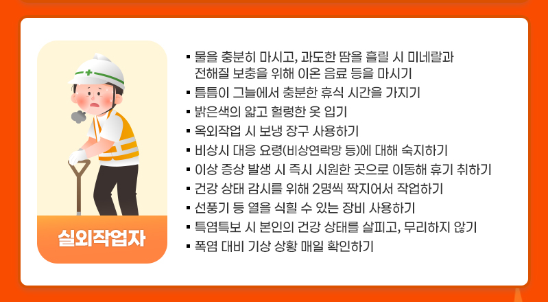 실외에서 일하는 근로자는 온열질환에 걸릴 위험이 높습니다. 다음 수칙을 지켜야 합니다.