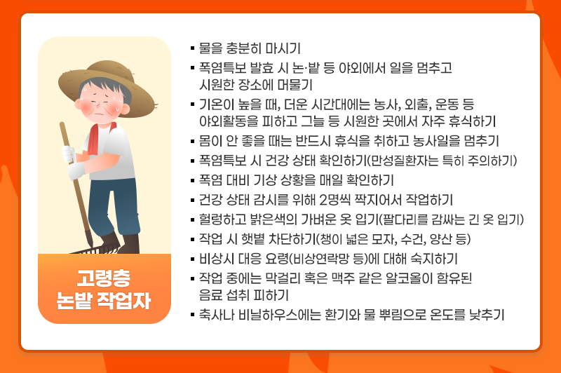 논밭에서 일하는 농부들도 온열질환에 취약합니다. 온열질환 예방을 위하여 다음 수칙을 지켜야 합니다.