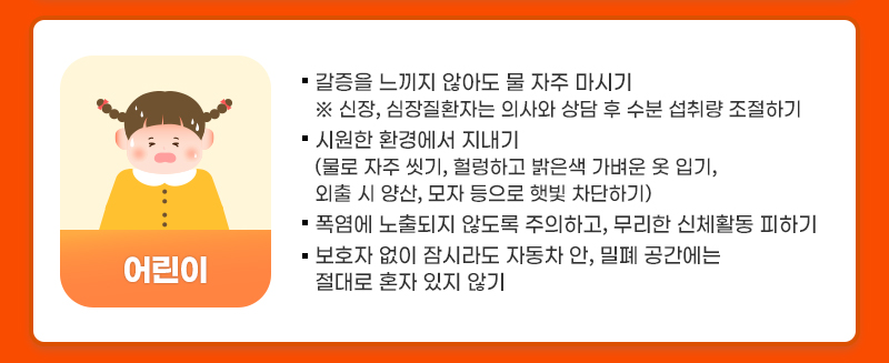 어린이는 성인보다 신진대사율이 높아 열이 많으며, 체온 조절 기능이 충분히 발달하지 않아 온열질환에 걸리기 쉽습니다. 온열질환 예방에 더욱더 유의해야합니다.
