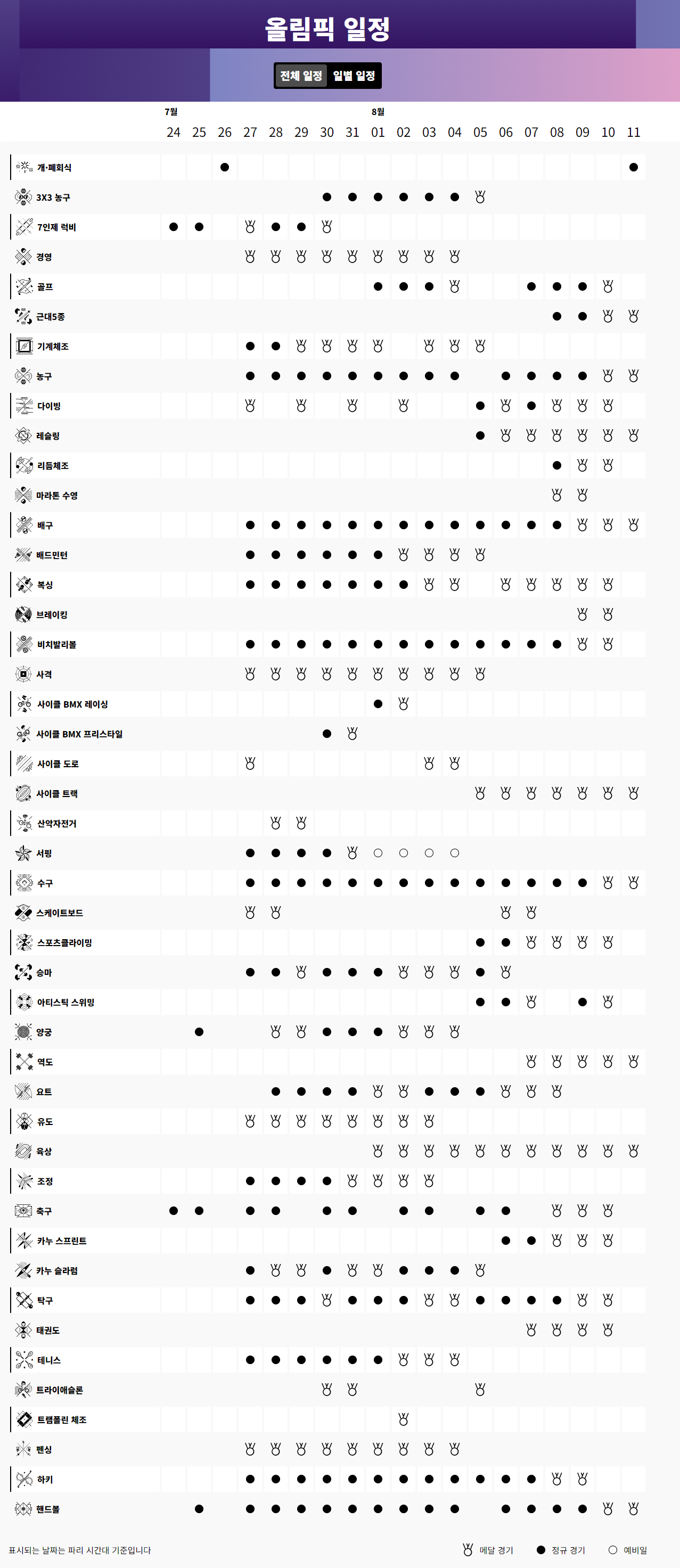 파리 올림픽 상기 일정은 상황에 따라 변경될 수 있습니다.
