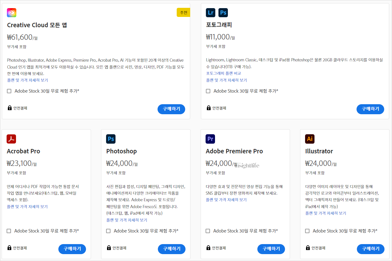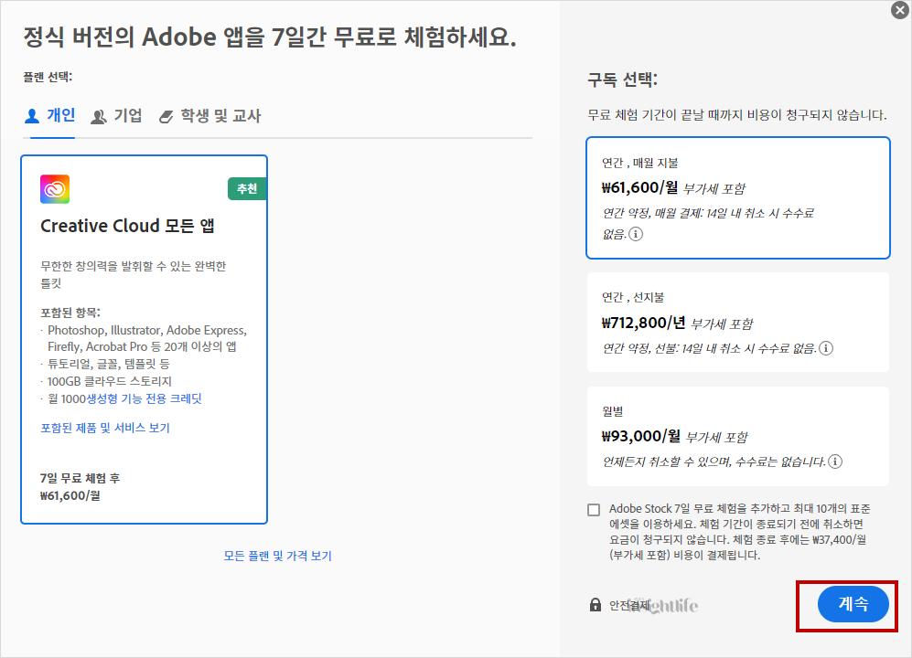 ✔ 체험 기간: 대부분의 어도비 소프트웨어는 7일간의 무료 체험 기간을 제공합니다. 7일의 무료체험이 끝나면 자동 결제되어 유료 사용이 되니 기간을 잘 체크하시기 바랍니다.