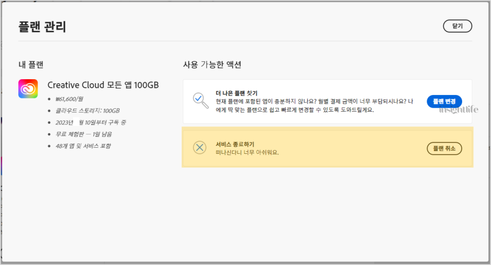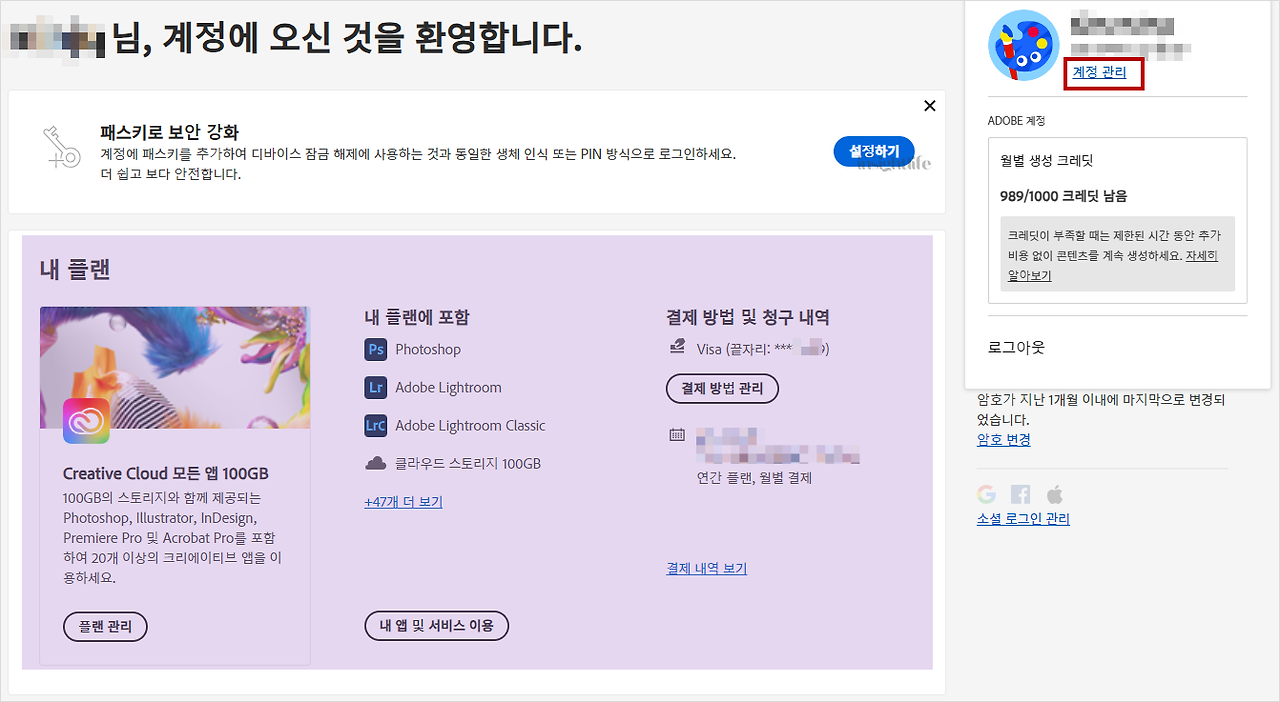 구독을 시작한 후에는 어도비 계정을 통해 구독을 관리할 수 있습니다.